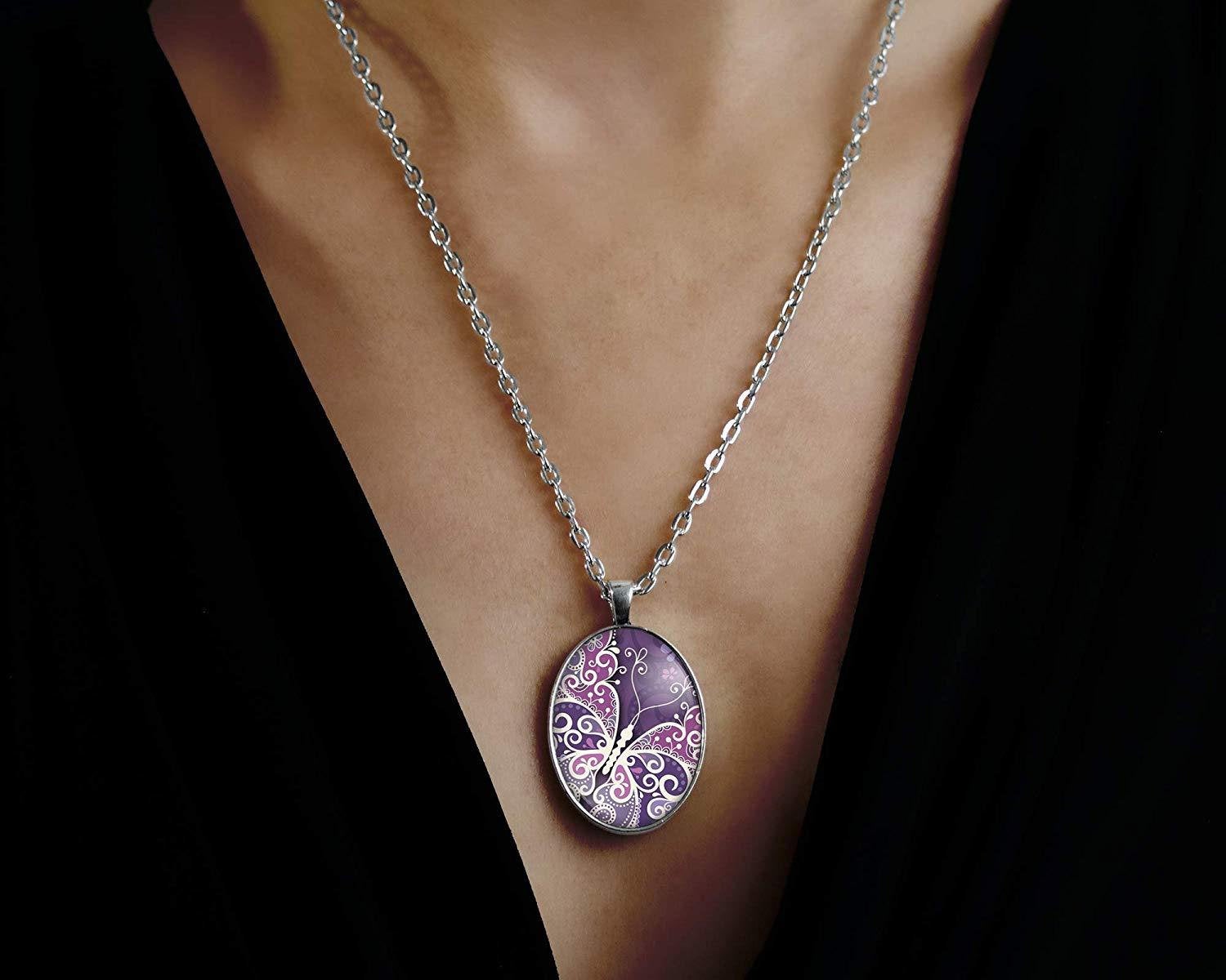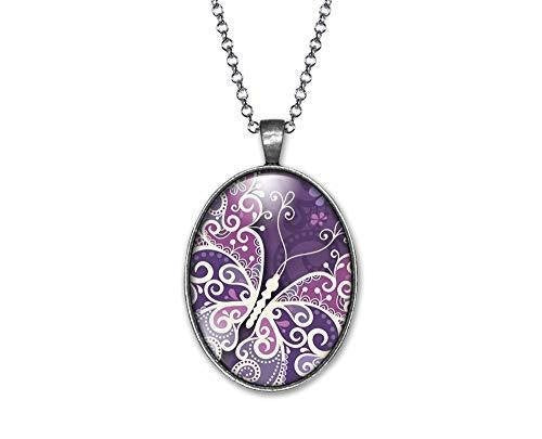 Collier Cabochon Papillon "Papillon Violet" , argenté (ref.43a)