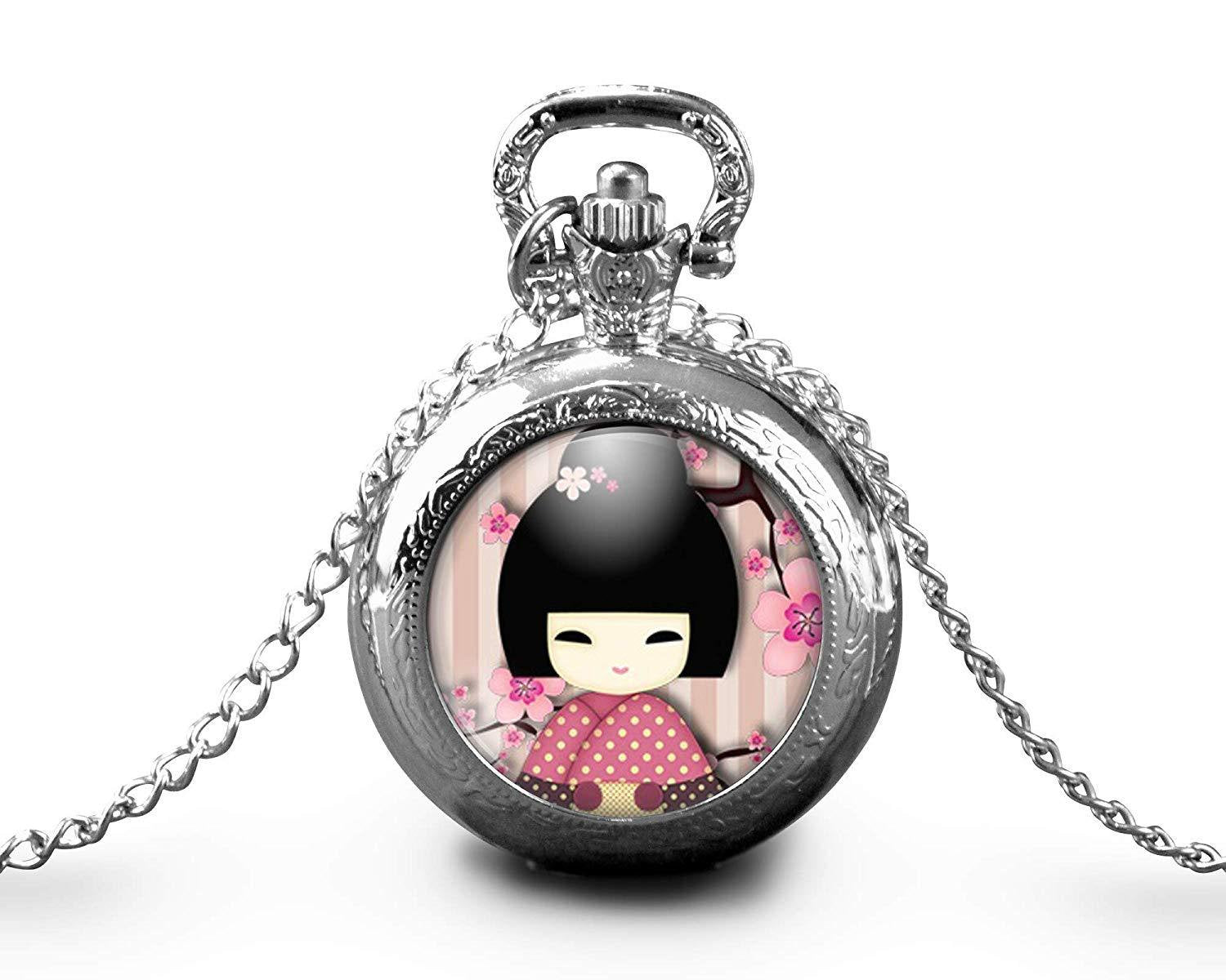 Montre gousset, Kokeshi "Kokeshi rose", argenté (ref.38a)