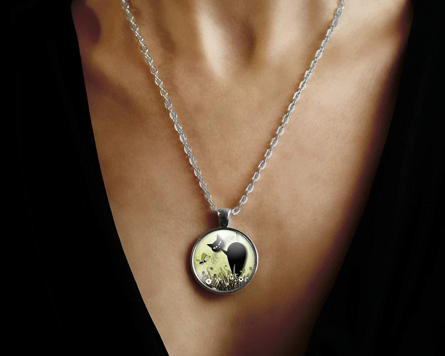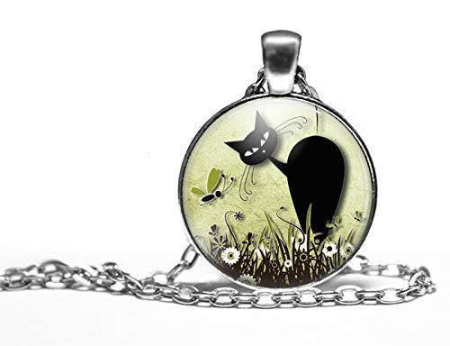 Collier cabochon, collier illustré "Le chat dans la prairie", argenté (ref.70-1a)